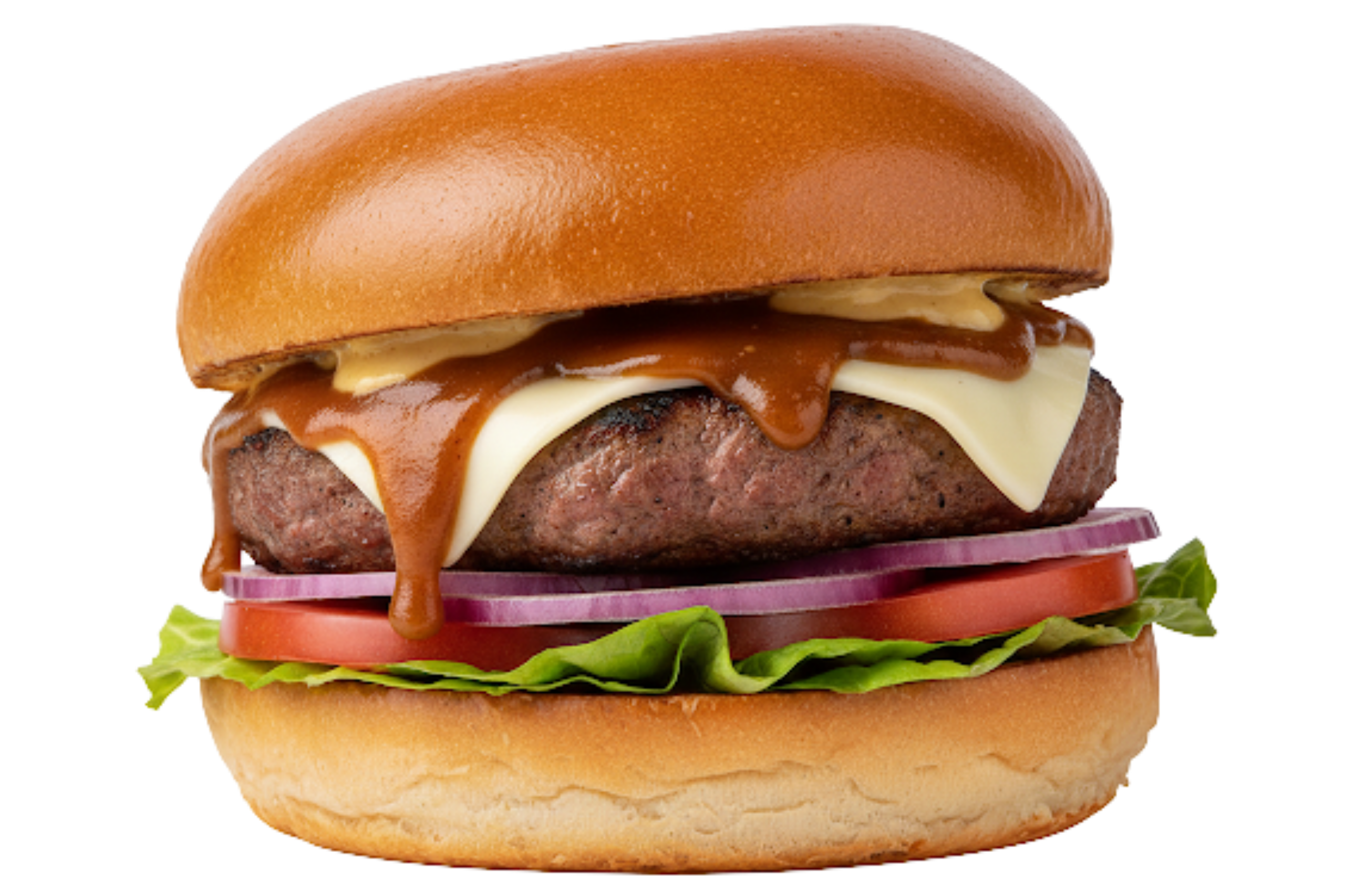 Brioche bun, Lamb patty, Tasty Cheese, Lettuce, Tomato, Onion, Flame Grilled Burger Sauce